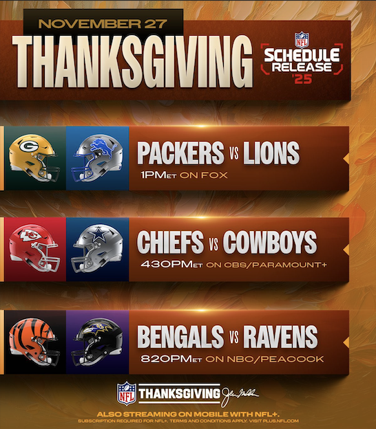 The afternoon game brings two national heavyweights to the table: the Dallas Cowboys and the Kansas City Chiefs. Anytime Patrick Mahomes and the Cowboys share a field, fireworks are guaranteed. Then, when night falls, the AFC North takes over as the Cincinnati Bengals face the Baltimore Ravens under the lights — a primetime showdown loaded with playoff consequences and star power. Three games, three massive storylines, and one unforgettable Thanksgiving Day of football.